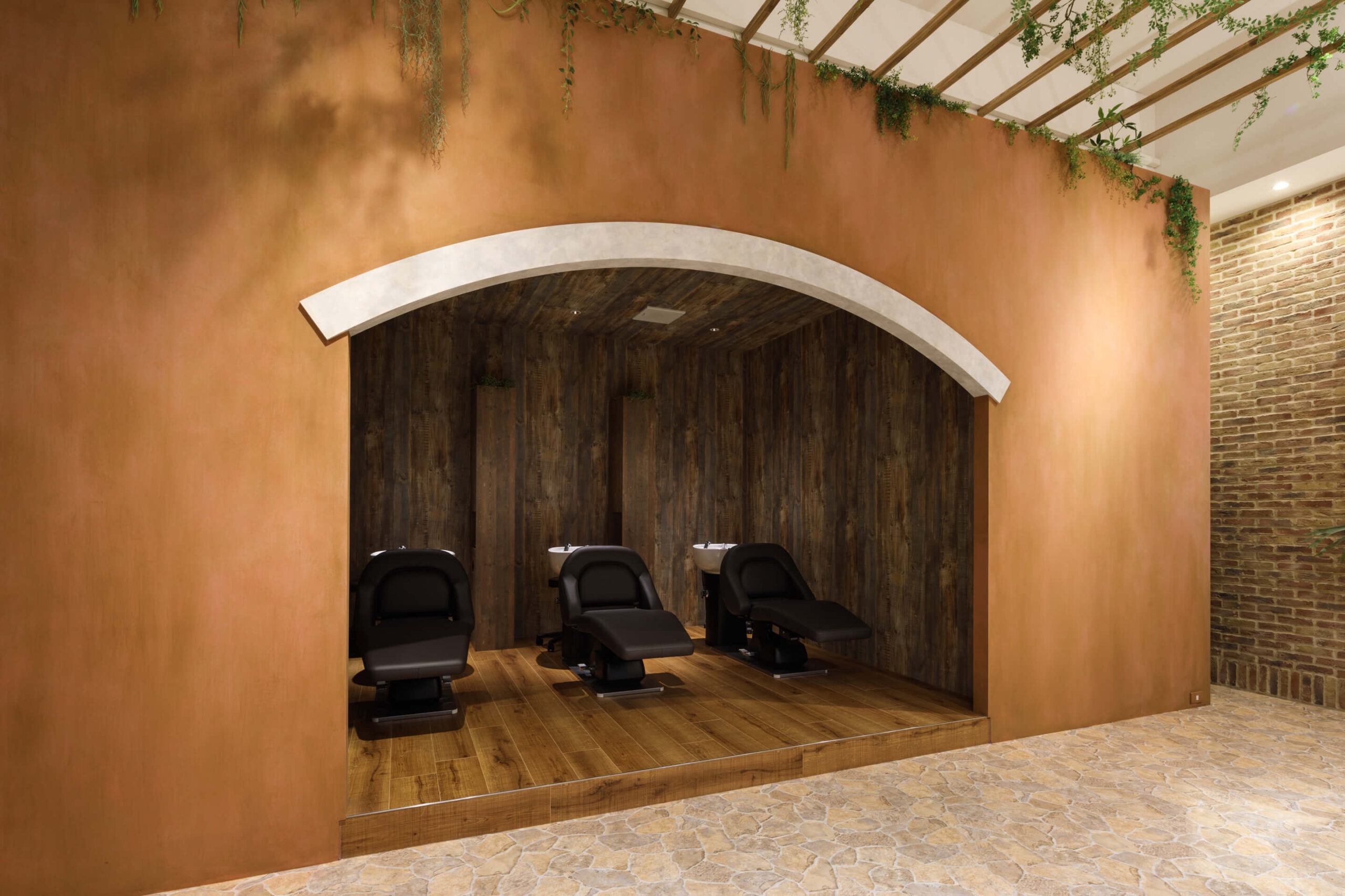 ヨーロッパの路地にあるカフェのオープンテラスをイメージした開放的なサロン。中央の植物の廻りに無造作にセット面が置かれた流動性のある賑やかな空気を演出。レセプションと一体化したバーカウンターで時間を待つシーンは本場カフェさながら。天井に吊られたウッドに絡まる植物など癒される飾り付けも魅力的。アーチの奥のシャンプースペースはビンテージウッドに囲まれたリラックス出来る空間。