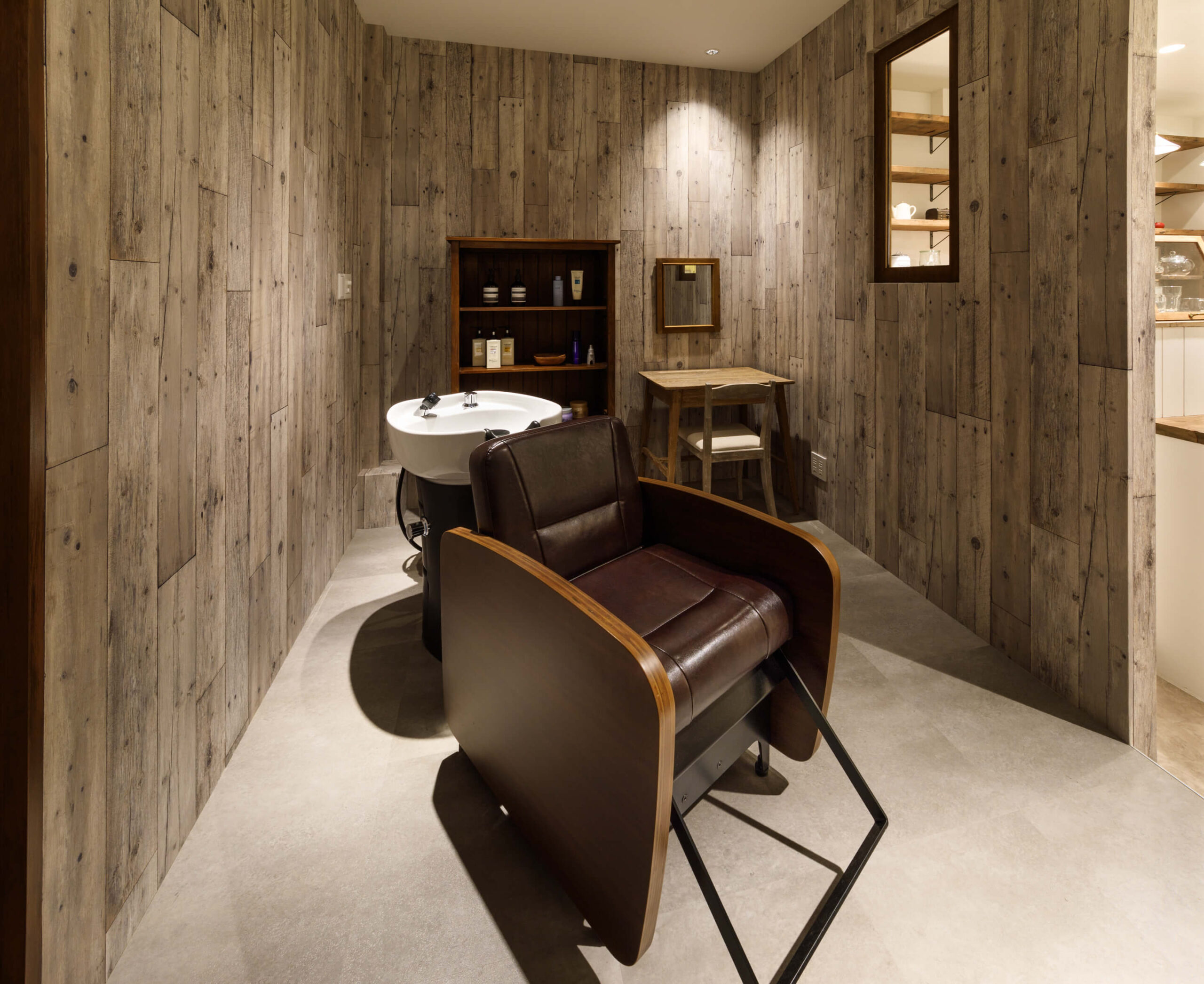 カフェのような美容室をテーマにデザインされたサロン。カフェカウンターとセット椅子が1つの空間に併存しながらも中央の柱によりしっかりエりア分けされたありそうでない空間。セット面が並ばない様にレイアウトすることで意図的に美容室らしくない空気感を演出。所々に棚や家具を配置しディスプレイされたお気に入りの雑貨に囲まれた楽しくてワクワクする空間。