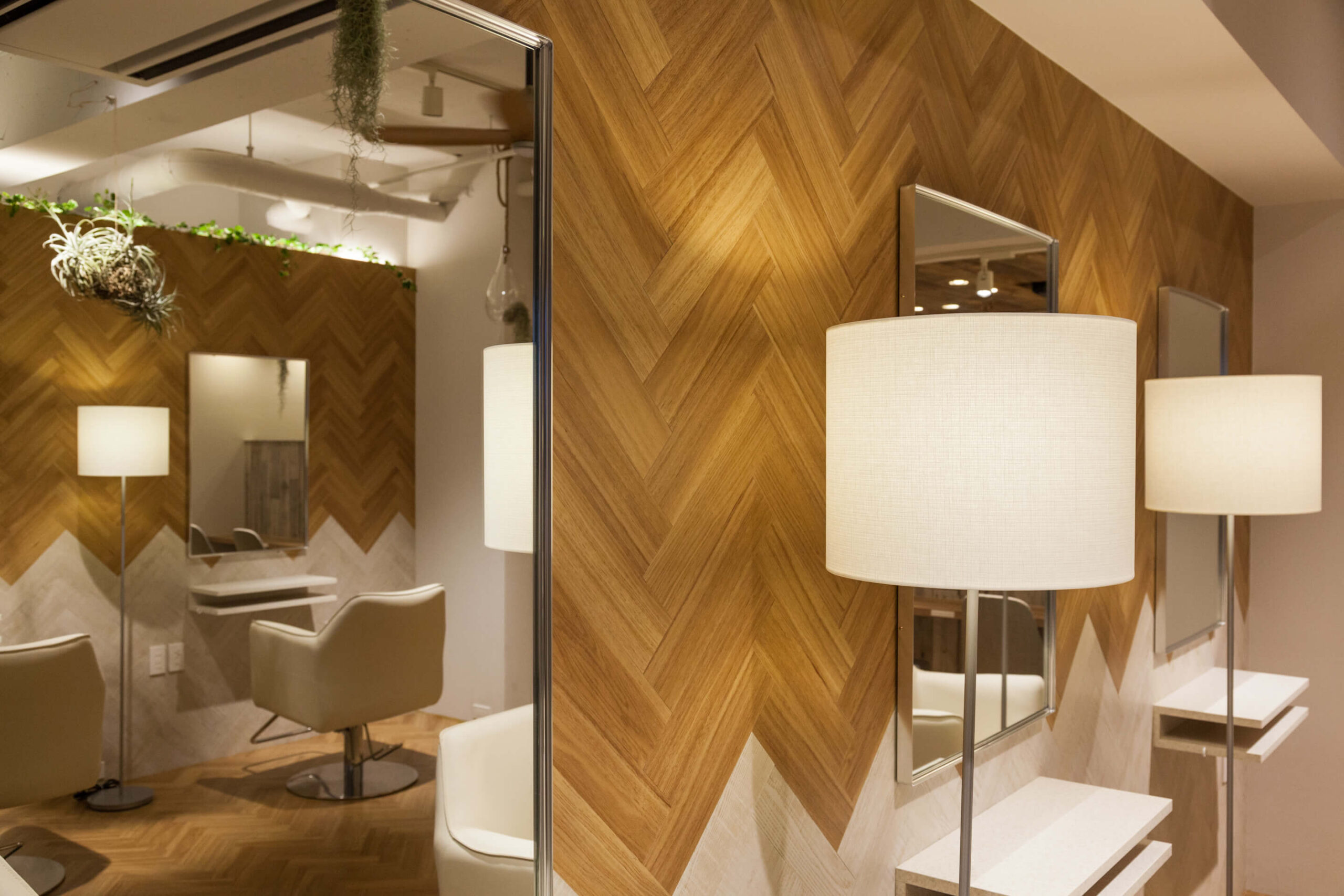 セレブなビーチリゾートをイメージしたハイクラスなヘアサロン。ナチュラル&ラグジュアリーをテーマに空間をデザイン。床から壁までヘリンボンで構成したソフィスティケイトされた空間にウッドパネルと植物を交互に配したストライプの窓から光が差し込む気持ちよいスタイリングスペース。天井に吊られた植物やシーリングファンにより心地よいリゾートを感じられる癒される空間。